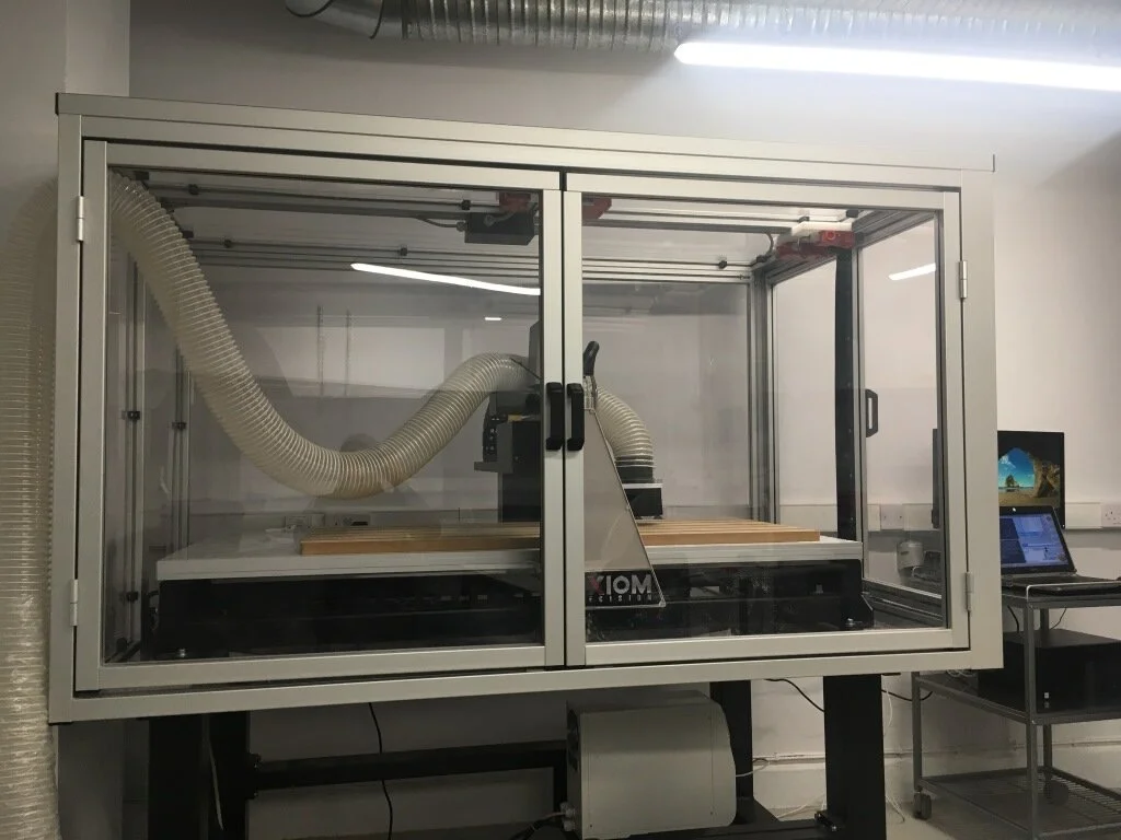We will supply the i2rA CNC router systems with full safety enclosures. The enclosures have an active interlock safety switch preventing the machine doors from opening when the machine is in use. We can supply with front and side opening doors as required.
